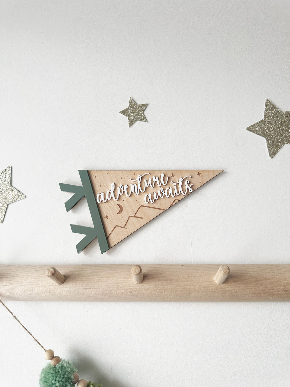 This pennant flag features pine green acrylic flag ‘strings’ and makes a lovely addition to your wall, perfect for an adventure theme room.