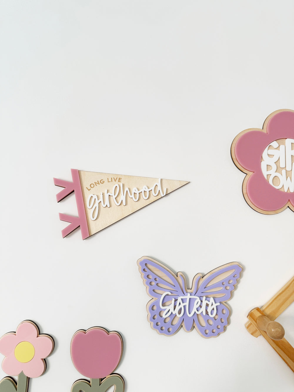 This pennant flag features beautiful blossom pink acrylic, with part engraved and part 3D acrylic lettering.