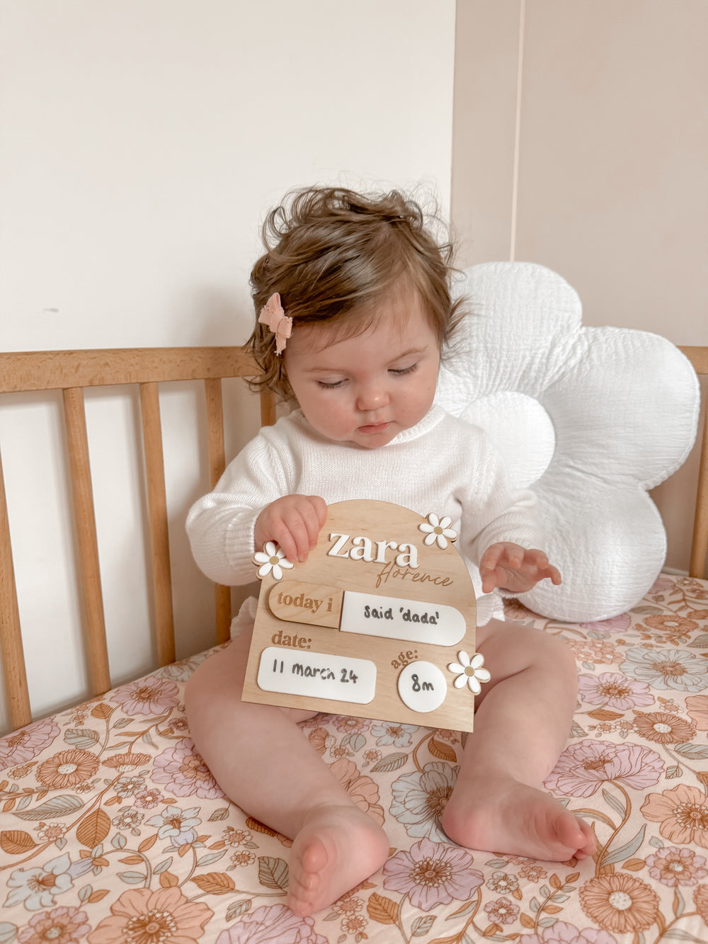 Document those exciting first milestones with this cute personalised board. With interchangeable magnets for 'My first' and 'Today I', this board makes a lovely photo prop for remembering that first tooth, or the day your little one said their first word.